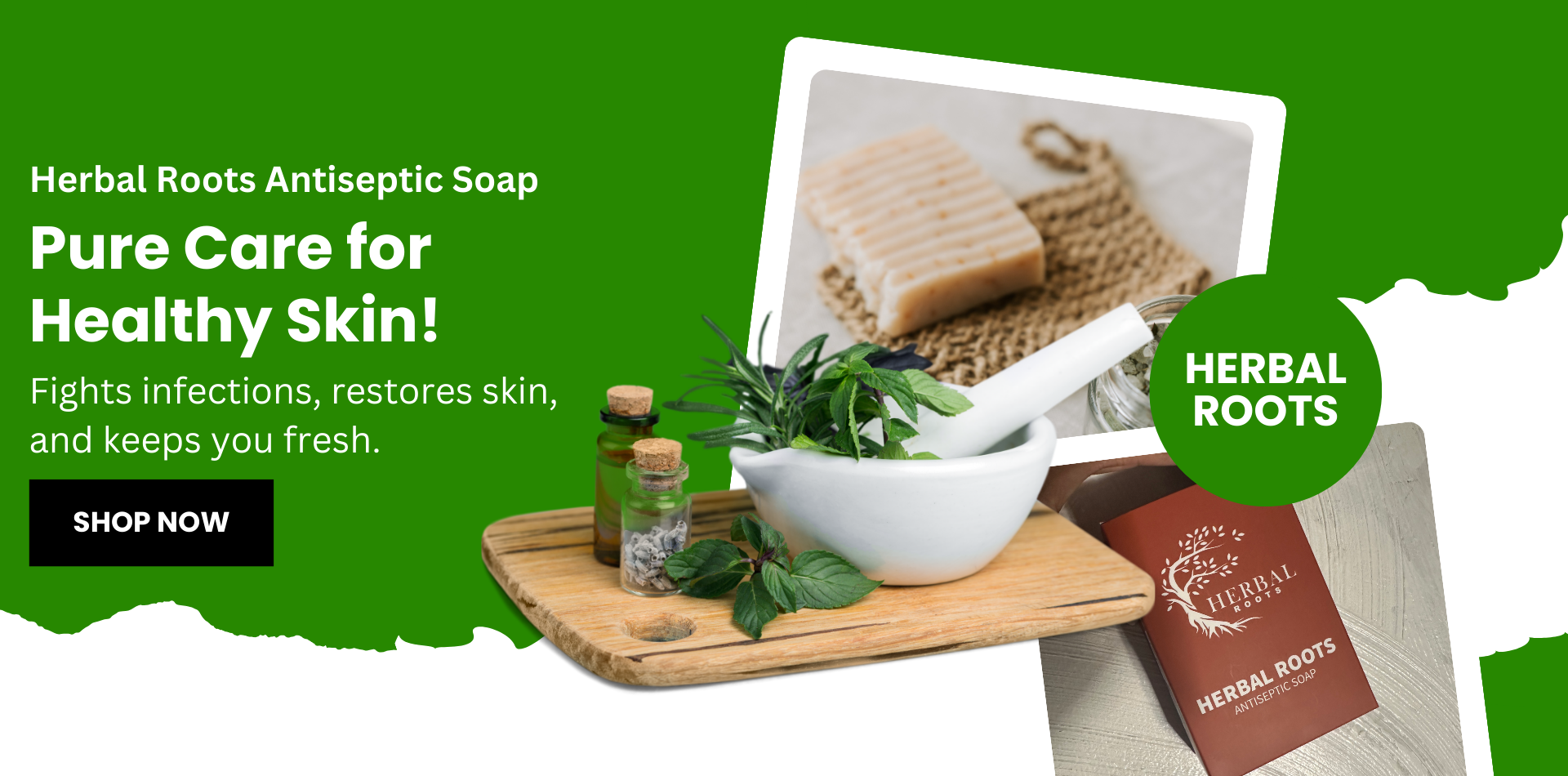 Herbal Roots Antiseptic Soap is an all-natural, herbal soap crafted with care using ingredients sourced exclusively from Africa. Gentle and safe for all skin types, it’s designed to tackle a variety of skin concerns, including odor, skin infections, discoloration, eczema, and acne. Infused with potent, natural antiseptic properties, it deeply cleanses while nourishing the skin, promoting a healthy, radiant glow. Experience the power of African nature with Herbal Roots Antiseptic Soap.